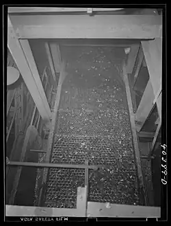 On the fourth level down, the coal was further cleaned of impurities.[4] This was originally done primarily by hand, but hand picking was gradually supplanted after 1910 by improved screens and jigs.[3] Although breaker boys worked at all levels of the coal breaker, most of the removal of impurities by hand occurred on this level.[4] (Some picking did occur on the ground level of the coal breaker, where boys would locate good pieces of coal in the culm and return it to the "clean" coal stream.)[4] Some coal might travel to this level directly from second level, if small enough, as at this level the screens and jigs were only capable of handling egg-grade coal and smaller.[2] This area of the coal breaker was also where most dry screens and wet jigs operated.[2] At this level, the use of conveyor belts (with or without paddles or scoops) was necessarily in order to move the smaller grades of coal, with most belts moving at about 33 feet per minute for pea coal and 50 feet per minute for larger grades.[2] Multiple sorting and picking levels might exist in a single coal breaker, depending on the amount of coal to be processed.