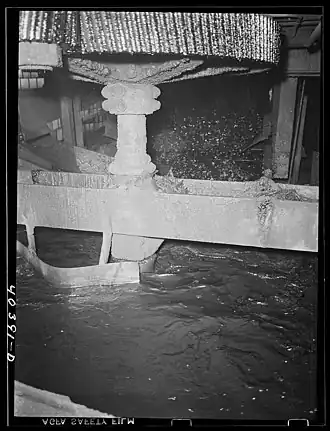 Raw coal often contains impurities such as slate, sulphur, ash (or "bone"), clay, or soil, which requires that it be cleaned before shipment to market.[2][8] Mine workers sampled the coal as it came out of the mine to determine whether the level of impurity recommended washing (if washing was available).[2][8] Slate, sulphur, and ash have a higher relative density than coal, and will sink in agitated water.[2][8] Passing the coal through the tipple was an essential pre-treatment process for coal washing, however, because the impure coal must be of similar sized lumps for coal washing to work.[2][3] If coal washing was conducted, coal might enter the breaker "wet". This meant the incline of the various belts and conveyors had to be lowered so that the coal did not slide on the belts or move too quickly down chutes.[2][8] Where coal washing was used, the coal breaker was expanded to handle both "dry" and "wet" coal simultaneously.[2][8]