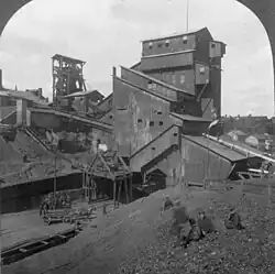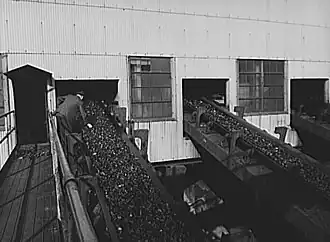 The modern coal breaker can be traced to 1844.[4] Joseph Battin, a supervisor at a coal gas manufacturing plant in Philadelphia, Pennsylvania, invented the first coal breaker—two cast iron rollers (one with teeth, one with holes to accept the teeth) through which the coal was crushed before it rolled down a chute and then through an inclined cylindrical screen.[9] The screen had a mesh which was fine toward the front and became progressively less so toward the end.[4] Larger chunks of coal, falling inside the cylinder as it rotated, broke up and eventually passed through the screen.[4][9] Impurities, which were heavier, tended to exit the breaker at the end of the screen.[4] The sorted coal would then be collected in bins below the screen, and transported to market.[9] A fellow Pennsylvanian, Gideon Bast, licensed the technology from Battin, and erected the first commercial coal breaker in Schuylkill County, Pennsylvania, on February 28, 1844.[4][9] A number of coal processing machines—such as rollers, crushers, washers, and screens—were developed in Europe and later utilized in the United States.[1] By 1866, the coal breaker in the United States had taken the form most recognized today, with multiple stories and numerous screening processes and mechanical sorting devices.[14] The first steam-powered shaking screens were used in the U.S. 1890, and the first steam-powered coal washers installed in 1892.[1]