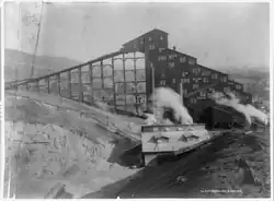 Ideally, coal breakers were placed so that the top of the breaking plant was equal to or slightly below the mine mouth so that gravity would move the coal to the breaking plant.[3][4] Where this was not possible, coal would be hoisted to the top of the coal breaking plant.[3][4] A boiler and boilerhouse would be located nearby to provide power for the hoist, moving screens, jigs, and crushers (although in more modern times this is supplied by electricity),[8] along with an engine house (to house the engine for the hoist), pumps and pumphouse (to supply the coal washing machines with water), and headframe (for the hoist).[3][4] The typical coal breaking plant was often eight or nine stories tall,[2] sometimes rising 150 feet high or more.[3][4]
