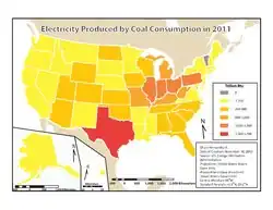 Coal generated about 19.5% of the electricity at utility-scale facilities in the United States in 2022, down from 38.6% in 2014[45] and 51% in 2001.[46] In 2021, coal supplied 9.5 quadrillion British thermal units (2,800 TWh) of primary energy to electric power plants,[47] which made up 90% of coal's contribution to U.S. energy supply.[48]