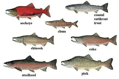 For thousands of years, long before colonization, Coast Salish people have depended on salmon as a staple food source as well as sources for wealth and trade. Salmon is deeply embedded in their culture, identity, and existence as First Nations people of Canada.[1] The five species of Pacific salmon found in waters of British Columbia are Sockeye, Pink, Chum, Coho, and Chinook. They are commonly found in the Fraser, Skeena, Nass, Somass, Thompson, and Adams rivers.[2]