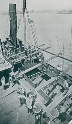 Coal bunkering of steamships in Sydney Harbour was a natural fit for the coastal coal trade. Sixty-milers could moor alongside a steamship and directly transfer coal to the ship's bunkers.[16] In 1909, the first of three mechanised coal hulks that would coal ships in Sydney was introduced.[17][18] After 1920, coal could be off-loaded and ships bunkered at the purpose-built bunkering facility, the Ball's Head Coal Loader.[19] Coal bunkering also took place at a "coal wharf" at Pyrmont.[20]