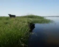 To the northwest the Djursland peninsula borders Randers Fjord. This narrow, 30 kilometre long wetland, cuts into mainland Jutland. The fjord is the outlet for Denmark's longest river, Gudenå.[1] The fresh water from the river mixes with salt water in the fjord. Along the fjord meadows and swamps often go directly into the fjord without any beaches. The bottom along the coastline consists of claylike silt, and one has to go quite far out to reach any significant depth in many places. These conditions are not favourable for beach life. In many places banks of reeds reach all the way into the fjord, making it impossible to walk along the coast. This lack of accessibility is characteristic for the north eastern borders of the Djursland peninsula in Randers Fjord.[4]