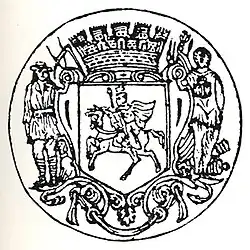 An early heraldic symbol for Bucharest was first used on seals of the town's judet (mayor) and pârgari (town council) as early as the 16th century: it usually featured images of the Madonna and Child or the Annunciation, and was accompanied by an inscription in either Church Slavonic or Romanian, which were simply variations of the phrase "this is the seal of Bucharest".[4]