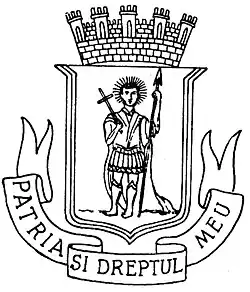 According to Constantin C. Giurescu, Alexandru Ioan Cuza changed the seal to depict the patron saint and an image of the mythical shepherd Bucur.[4] However, it appears that St Dimitrie Basarabov (or St Demetrius) was introduced as a symbol during Cuza's reign (in 1864, as attested by Monitorul Oficial).[2] The arms were enlarged after World War I, when the mural crown and all other present-day elements were added, while the image of Bucur was removed.[4]