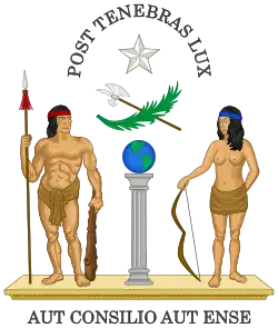 Standing, on both sides of the fixture, was the figure of an indigenous woman and a man. On top of everything was written, in Latin, Post Tenebras Lux ("After the Darkness, Light") and at the bottom, Aut Consilio Aut Ense ("By Council or by Sword").