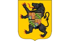 After gaining cultural autonomy in 1972, the then Cultuurraad van de Nederlandse Cultuurgemeenschap (Cultural Council of the Dutch Cultural Community) voted the decree of 22 May 1973 adopting the Flemish lion as its official flag. Shortly afterwards, the Cultuurraad also adopted a coat of arms: Or, a lion rampant sable, armed and langued gules, five mullets sabel in orle. The five stars surrounding the lion were meant to denote the five Flemish provinces. The inclusion of black stars caused a small controversy. Some objected to their colour, others regarded them as a needless Americanism. It was therefore suggested to replace them with a sheaf of arrows, an idea taken from the arms of the Netherlands. Notwithstanding the criticism, these arms were adopted by the Flemish Community (Decree of 30 March 1988) when it took over the attributions of the Cultuurraad. Shortly afterwards however it was decided to return to the original arms of Flanders (Decree of 7 November 1990), thereby making the arms identical to the flag.[2] The Flemish lion has also become associated with the far right in the northern Netherlands.