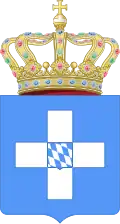 The introduction of the blue shield with the white cross as the heraldic device to represent Greece occurred on 26 February [O.S. 7 January] 1833,[13] when the regency council which was governing Greece on behalf of its first king, Otto, announced the official design for the coat of arms. Approved by Prime Minister Josef Ludwig von Armansperg, it detailed the entire heraldic achievement and described, in Greek and German, its constituent parts. The lesser arms are described as an "equidistant azure escutcheon, pointed towards the middle of its lower side, and containing the Greek cross, argent, bearing at its centre an inescutcheon with the lozenges of the Royal House of Bavaria."[13] The shade of blue is specified as light blue (German: hellblau).[13] The escutcheon itself was supported by two crowned lions rampant and surmounted by the royal crown.[13] The entire composition was contained within a mantle and pavilion, purple[14] on the outside and ermine on the inside, topped again with the royal crown.[13] This emblem was discarded following the 23 October 1862 Revolution and Otto's subsequent exile. Despite this fact, however, the blue shield with the white cross remained the basis upon which all subsequent coats of arms were based, including the current arms of the Third Hellenic Republic. The white and blue cockade of the revolutionary period was reinstated in March 1833, this time blue on the outside and white on the inside, so that the blue centre was equal to two thirds of the diameter of the cockade.[15] This design, described both as a 'national emblem' (ἐθνόσημον) and a 'cockade' (κοκάρδα) in Greek and as the 'national cockade' (National-Kokarde) in German, was to be worn on caps by uniformed military and civilian personnel as well as on the hats of private citizens that wished to display their national pride.[15]
