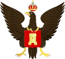 De Rijksadelaar, houdende op deszelfs borst een schild van keel, beladen met een dubbelde tooren van goud.