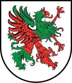 The coat of arms of the West Pomeranian Voivodeship, Poland depicts a red griffin with a yellow (golden) beak and claws standing in the combat position, placed within the white (silver) Iberian style escutcheon.[35] It was designed by Jerzy Bąk, and its design was based on the red griffin present on the banner used by the forces of Casimir V, duke of Pomerania-Stettin, during the Battle of Grunwald in 1410.[34]