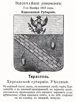 In 1868, a draft of the new coat of arms of Tiraspol was created. It was composed by a scarlet wall in the form of a scalloped baldric with silver seams, accompanied in the corners by two green acorns, in a silver shield. In the upper-right corner of the shield is the coat of arms of the Kherson Governate.[3]