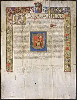 The castle in gold on gules is the emblem of Castile, which represents the fortresses built during the Reconquista. In the context of Tlaxcala, it represents that city as a new Castile, victorious over the Mexicas during the Conquest. The eagle in black on gold is the heraldic image of the House of Habsburg, to which Charles I belonged, who granted the shield. The argent border represents the Catholic faith, which the Tlaxcalans would have embraced without opposition. The initials correspond to the Latinized names of Queen Joan of Castile, Charles himself and the then Prince Philip. The two crowns represent the aforementioned Joan, Queen of Castile and her son Charles V, Holy Roman Emperor monarch of the same Crown. The palms are a symbol of victory, in this case over the Mexicas. The skulls and tibias evoke similar pre-Hispanic glyphs and may refer to human sacrifices in Mesoamerican culture; it has been suggested that they represent the Mexicas killed during the capture of Tenochtitlan in 1521.[1]