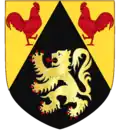 The Coat of arms of Walloon Brabant symbolizes the province's historical and cultural heritage. It featurse a yellow lion with red claws and tongue on a black field (Leo Belgicus), representing the former province of Brabant and the Duchy of Brabant. and two red gallic roosters on a yellow background occupy the upper corners, symbolizing the Walloon region