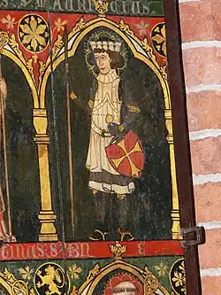 By mid-13th century, artistic evidence shows similar plate pattern to that of St. Maurice's Effigy in a German manuscript.[9] The fact that German men-at-arms often are described with this armor in art or military records under foreign lands might suggest they were behind their popularization in Europe by that time. The coat of plates worn by German knights at the battles of Benevento in 1266 and Tagliacozzo in 1268 rendered them nearly invincible against French sword blows, until the French realized the German armpits were poorly protected.[10] Contemporary to this, Scandinavian sources from mid-to-late 13th century also make reference to it: in the Konungs skuggsjá, from around 1250, it is called a Briost Bjorg and specifies that is should cover the area between the nipples and the belt. The later Hirdskraa of the 1270s calls it a plata, informing that it should be worn beneath the hauberk, permitting it only to the highest ranks of Scandinavian military, from skutilsvein (knight) and up. In Barcelona, for instance, there was a local production of coats-of-plates — then called "cuirasses" − beginning in 1257; King James II of Aragon ordered such cuirasses to be made for him and his sons in 1308, which were covered in samite fabric of different colors.[11]