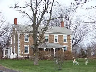 The walls of the two-story structure are made with rounded field stones between limestone quoins that both decorate and stabilize the walls.[2] The multi-colored field cobbles are held in place with limestone mortared "V" joints, typical of cobblestone construction of the Middle Period.[4] The quoins are twelve inches (300 mm) high, and there are three to four courses of cobblestones for each quoin. The house is laid out with two windows on either side of a central entrance. The one-story porch outside the front door has Victorian details under a hip roof. The Greek Revival features of the entrance include square pilasters and half side-lights. The builder and/or architect is not known.[2]