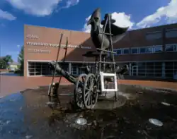 The five-meter high statue The fountain in front of the entrance of the museum was made especially for the museum by Karel Appel. The statue contains four water outlets and it is the only fountain ever made by Karel Appel. The unveiling of the statue took place in 2001 on the occasion of Appel's eightieth birthday. The model of the fountain was donated to the museum by Karel Appel and is on permanent display. The fist in the fountain symbolizes strength and the bird represents freedom. Various elements that make up the fountain are so-called objets trouvés.