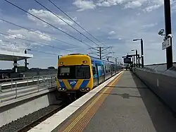 The station consists of two side platforms with two edges. As is standard in Melbourne, the platform has an asphalt surface with concrete on edges. The side platforms are approximately 160 m (524 ft 11 in) long, long enough for a 7 car High Capacity Metro Train.[4] The station features a ground level concourse, accessible by stairs and lifts up to the elevated platforms.[6] There is one main station building, opened in 2020, which contains a waiting room, a customer service, PSO office and a ground level concourse inside the main station building.[8] The station building presents as a civic gesture drawing abstract references to the formal language of classical architecture and has decorative features such as friezes, hexagonal reliefs on the pre-cast elements and the primary colours of the station are orange.[9]