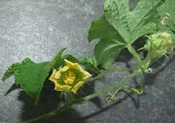 Perennial, dioecious climber. Shoot length up to 5 m, more or less densely covered with white hairs. Leaves are alternate with 1.5-14.0 cm long petiole, lamina 7.5–12.0 × 6.5–12.0 cm, often cordate to profoundly 3- or 5-lobate. If lobate, then the central lobe is dominating and has a sharp tip. Upper lamina glabrous with clear to whitish pustules, sometimes with white hairs. Lower lamina paler than upper lamina, with white hairs, that can appear wart-like when broken off. Tendrils simple. Probracts up to 3 mm long.