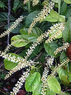 The species are shrubs and trees, and lianas, mostly evergreen. The leaves are alternate, often large (to very large in some species; up to 2.5m (8 feet) long in C. gigantifolia),[5] with the leaves on juvenile plants often larger and of different shape to those of mature plants. The flowers are produced in spikes. The fruit is a three-angled achene, surrounded by an often brightly coloured fleshy perianth, edible in some species, though often astringent.[3][4] Species in the genus have been characterized as dioecious,[6] but this is unclear.[7] Trioecy has been documented in C. cereifera.[8]