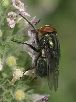 Cochliomyia macellaria, also known as the secondary screwworm, is a species of blow fly in the family Calliphoridae.[1][3][4] These screwworms are referred to as "secondary" because they typically infest wounds after invasion by primary myiasis-causing flies.[1] While blow flies may be found in every terrestrial habitat, C. macellaria is primarily found in the United States, American tropics, and sometimes southern Canada.[5] They are most common in the southeastern United States in states like Florida. C. macellaria have a metallic greenish-blue thorax and a red-orange head and eyes.[6] These adult blowflies range from 5–8 mm in size.[6]