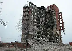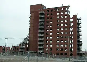 Built by the same firm, Leinweber, Yamasaki & Hellmuth,[2][3] as the infamous Pruitt–Igoe complex, Cochran Gardens was more successful than its ill-fated sister project. In the mid 1970s, Bertha Gilkey and a group of friends successfully led a community driven rehabilitation effort; in 1976 she won a property management contract from the city.[4] Independent management improved Cochran Gardens and created small business jobs in the neighborhood.[5] President George H. W. Bush visited the site in 1991, commending tenant management and Bertha Gilkey. However, in 1998 city authorities took over Cochran Gardens, citing tax mismanagement by the tenant association. The buildings rapidly deteriorated. By 1999 vacancy rate increased from under 10% to one-third.