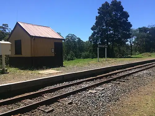 Cockatoo railway station is situated on the Puffing Billy Railway in the town of the same name. It opened with the line on 18 December 1900 as Devon, but was renamed Cockatoo Creek on 29 July 1901 and subsequently shortened to Cockatoo in 1904. There was originally a platform road and a loop siding, but a crossing loop was later added in between the two. A single 12ft by 20 ft timber portable station building was provided which was later extended. Other associated buildings such as toilets and a van good shed were also on the platform while a weatherboard goods shed was provided on the loop siding (No. 3 Road).