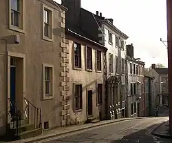 The main town developed under the Normans who, after occupying the former Roman fort, built Cockermouth Castle closer to the river crossing; little remains today of the castle thanks to the efforts of Robert the Bruce. The market town developed its distinctive medieval layout, of a broad main street of burgesses' houses, each with a burgage plot stretching to a "back lane": the Derwent bank on the north and Back Lane (now South Street), on the south.[12] The layout is largely preserved, leading the British Council for Archaeology to say in 1965 that it was "worthy of special care in preservation and development."[11]