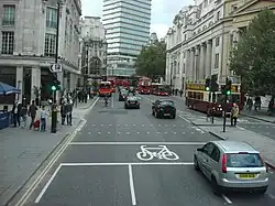 ![]() The whole road viewed from Charles I roundabout since 1675 forming Charing Cross. At the end are the Brazilian Embassy across the junction with the Pall Mall New Zealand House. Canada House engulfing Oceanic House lines the right, north side of the street | |