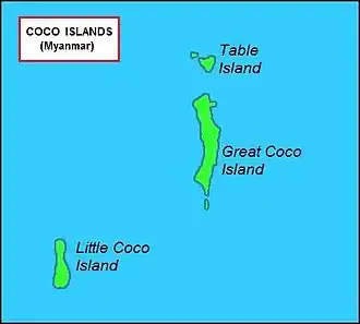 ![]() Coco Islands Location of Coco Islands in Myanmar and in the Bay of Bengal ![]() Coco Islands Coco Islands (Bay of Bengal) | |