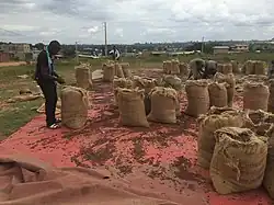 The crop is grown in Ivory Coast mostly by smallholder farmers planting on 1 to 3 hectares.[10] The pods containing the beans are harvested when a sufficient number are ripe, opened to separate the seeds and pulp from the outer rind. The seeds and pulp are usually allowed to ferment somewhere on the farm, before the seeds are dried in a central location. The dried seeds are purchased by a traitant or a buyer who travels among villages in an area to weigh, purchase, and collect the crop. The traitant then takes the crop to a short-holding warehouse in a major town or city where major exporters purchase the seeds and arrange for its export from Ivory Coast.