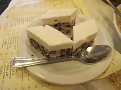 Coconut bar is a refrigerated dim sum dessert found in Hong Kong, Taiwan, Southern China and in overseas Chinatowns. It is sweet and has a soft, gelatin-like texture but is white in color rather than translucent like gelatin. It is sometimes referred to as coconut pudding.