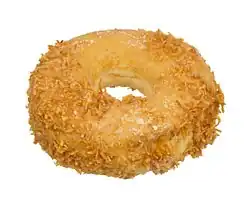 The coconut doughnut (or coconut donut) is a variety of doughnut in the United States and Canada that is usually covered or topped with shredded or flaked coconut topping. It is often toasted or broiled, and there are variations made with chocolate[1] and, in a 1959 recipe, orange juice in the dough and icing.[2]