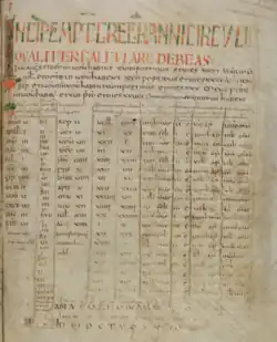 Part I of the Codex Sangallensis 902 consists of the Ars grammatica by the Greek grammarian Dositheus. It was compiled in the 4th century with the aim of teaching Greeks Latin.[8] The Recensio Interpolata then constitutes the second part of the Codex. It encompasses 35 pages with 45 illustrations accompanying the Latin text. The illustrations are of elements such as the astrological signs or the planets. There are also some drawings of celestial globes. The third section of the manuscript contains the liber de computo by Rabanus Maurus, whilst the fourth part contains a Greek Computus . Finally, the fifth segment of the Cod. Sang. 902, which is only five pages long, consists of a series of Cycli decemnovenales (cycles of 9 years).[6]
