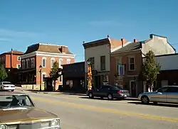 None of the facilities that were associated with Le Claire's 19th century industries are extant.[2] What remains are commercial and residential structures built between 1850 and 1900 and new construction. The commercial buildings from the 1850s and 1860s were built mostly of locally produced soft brick. The structures are narrow, two stories in height at street level, with either two or three bays on the main facade. They are capped by either broad, low-pitched gable or half-hip roof or a front-gable. For the most part, building foundations are from locally quarried limestone. The buildings on the east side of the street have exposed basements because the land drops steeply to the river at that point. The houses were built in either the Greek Revival style with symmetrical fronts and a gable roof, or in a vernacular form of the Italianate style with low hipped roofs and bracketed cornices. The houses were constructed mainly in wood or brick, and rarely in limestone.