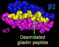 The response to the 33mer occurs in most coeliacs who have a DQ2 isoform. This peptide, when altered by intestinal transglutaminase, has a high density of overlapping T-cell epitopes. This increases the likelihood that the DQ2 isoform will bind, and stay bound to, peptide when recognised by T-cells.[85] Gliadin in wheat is the best-understood member of this family, but other prolamins exist, and hordein (from barley), secalin (from rye), and avenin (from oats) may contribute to coeliac disease.[32][58][86] Avenin's toxicity in people with coeliac disease depends on the oat cultivar consumed, as prolamin genes, protein amino acid sequences, and the immunoreactivities of toxic prolamins vary among oat varieties.[24]