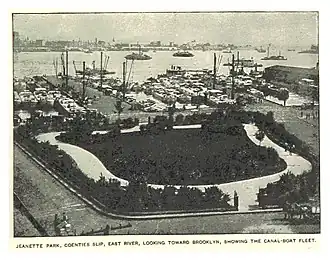 Arthur Bartlett Maurice describes Coenties Slip in the 1935 book Magical City: “At the head of the Slip, where the Elevated road winds its way along Pearl Street on its way from South Ferry to Hanover Square, stood the Stadt Huys of Dutch days, the first City Hall on Manhattan Island. After the Erie Canal was finished in 1825, the slip, then only a tiny corner of what it is today, harbored many of the canal boats."[7] The land was infilled by 1835 and new buildings were developed, only to be destroyed shortly afterward in the Great Fire of New York.[7]
