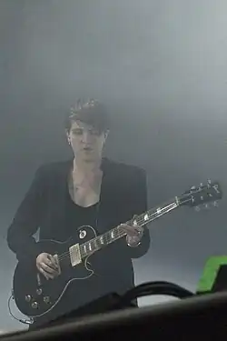 In 2011, the xx opened their own recording studio in London and began writing songs for Coexist during the summer.[4][12] Each member—guitarist Romy Madley Croft, bassist Oliver Sim, and Smith—wrote music individually and recorded snippets using GarageBand or their phones.[13] Both Croft and Sim drew on personal experiences and wrote more direct lyrics than on the band's debut to express complex emotions.[11] Sim said of his songwriting for Coexist, "I found myself being a lot less 'moons and stars' and being a lot more literal."[11] Croft felt more expectations from listeners than when the band debuted and consequently turned to more personal songwriting for Coexist: