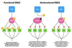 Mutations in the RPS6KA3 gene can result in expression of an RSK2 protein (ribosomal S6 kinase 2) with reduced or absent kinase function. RSK2 is a downstream component of the MAPK (mitogen-activated protein kinase) cascade that is itself a kinase. RSK2 phosphorylates cellular proteins (including histone H3, and CREB), which regulate eukaryotic gene expression. In individuals with Coffin–Lowry syndrome, phosphorylation of transcriptional regulators is reduced due to the weakened activity of RSK2 kinase activity. RSK2 is normally activated by the ERK MAP kinase. Mutated RSK2 may be deficient for activation by ERK, or its kinase activity may be reduced despite activation by ERK. The most common mutation in RPS6KA3 is an early stop codon that fails to produce a functional protein, indicating that disease etiology most likely arises from loss-of-function effects. Substitution mutations (which alter a single amino acid) have also been shown to give rise to the disease. RSK2 is highly expressed in the brain, specifically in the neocortex, hippocampus, and Purkinje cells, all of which are involved in cognitive function and behavior. There is some experimental evidence that RSK2 regulates synaptic transmission and plasticity in neuronal cell types.[9]