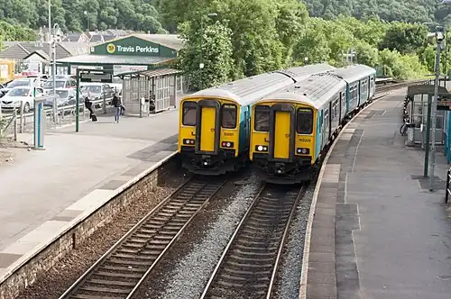 ![]() Two Class 150 DMU trains wait at Cogan station | |||||