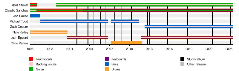 All of Coheed and Cambria's albums except for 2015's The Color Before the Sun are concept albums based on a science fiction storyline called The Amory Wars, a series written by Claudio Sanchez, which has been transcribed into a series of comic books as well as a full-length novel.[3] The band has released eleven studio albums, three live albums, and several special-edition releases. Six of their albums have reached the Billboard Top 10.[4] The band's eleventh studio album, Vaxis – Act III: The Father of Make Believe, was released in 2025.