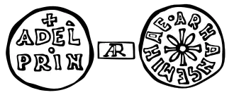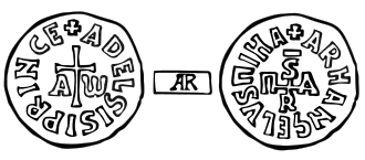 The first one[10] on the obverse presented in the field, on three lines, the legend + / ADEL' / PRIN and on the reverse a cross set aside by four lozenges, surrounded by the legend - ARHANGEMIHAE ("Archangel Michael"), very similar to the reverse of the deniers of Grimoald IV with the spike, part of the Lombard coinage of Benevento.[9][11][12] The title used was that of prince and the dedication was to the archangel Michael.