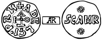 In the fourth period coins were minted in the joint name of Adelchis and Pope John VIII.[32] From this period, dated 871, only one type is known, which had on the obverse the legend ADELGI - PRN around a cruciform monogram with the letters IOHA (Iohannes, the pope's name in Latin) and on the reverse, in the field, the legend SCAMR (Sancta Maria).[29][32]