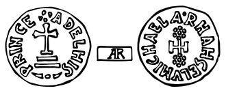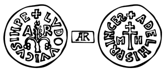 The first had on the obverse the image of the ear already used by Grimoald IV[30] with the legend + LVDOVICVSIMPE around it; on the reverse, a patriarchal cross set aside by the letters "M" and "H" (for Michael) and the legend + ADELHIS PRINCES, with the last "S" mirrored.[31]