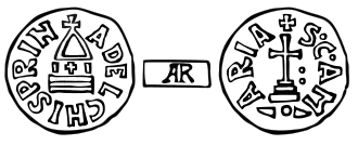 The third type[14] had in the field the letters P ADL R (Adelchi Princeps) arranged in three lines to form a cross, surrounded by the legend + SANCTA MARIA.[15]