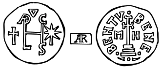 The seventh type[25] presented on the obverse a monogram of the name Adelchis[26] surmounted by a "∇" and flanked on the right by a cross and on the left by a monstrance. On the reverse the coin featured the legend - BENE - - - BENTV around a cross on three steps flanked by the letters "M" and "H" (for Michael Angelus). This coin featured types taken from a denier minted by Grimoald III more than half a century earlier; in the latter denier the monogram on the obverse consisted of the letters forming Grimoald's name. On the reverse of Grimoald's denier the cross was set aside by the first and last letters of the Greek alphabet (Α and ω).[27][28]