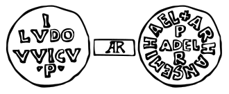 | In the field, in four lines I / LVDO / VVICV / P (Ludovicus Imperator) | + ARHANGELMIHAEL ADELHIS. In the center in three lines P / ADEL / R (Adelchis Princeps) |