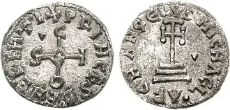 The sixth type[20] featured the so-called "Carolingian temple," already used by Charlemagne. In his fourth coinage, dated 812-814, Charles had introduced the type of deniers with an imperial, Roman-style portrait used for the obverse. One of the reverses featured a peristyle (i.e., four-columned) temple surrounded by the legend XPICTIANA RELIGIO (Christiana religio), in which Greek letters were also used in the Latin text: "Χ" (chi), "Ρ" (rho) and "С" (lunate sigma), instead of "ch," "r" and "s," respectively.[21] The temple motif was also used in the coinage of Louis the Pious,[22] with differences in the legend, which became XPISTIANA RELIGIO with the letter "S" instead of Charles' lunate sigma.[23][24] The temple used by Adelchis had a tympanum on the apex of which was a cross, while there were two columns, separated by a small cross placed in the center. The legend was ADELCHIS PRIN. The reverse depicted a cross on steps surrounded by the legend S-C-A-M ARIA (Sancta Maria).[15][19]