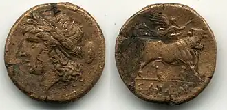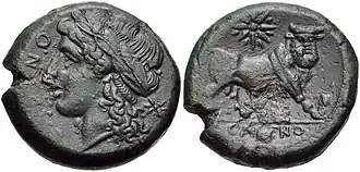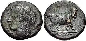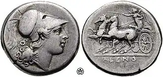 The obverse of the Cales didrachm features the bejeweled head of Athena, with Corinthian helmet adorned with feathers. There may be various symbols: on the helmet, behind the head. Sometimes there are letters under the neck in the Greek alphabet.[35] The type with the head of Athena is widely used in the coinage of the Greek world, such as in the coins of Athens and Corinth.[36][37]