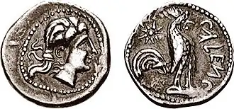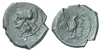 | Head of Minerva with Corinthian helmet | CALENO; standing rooster, star behind. |